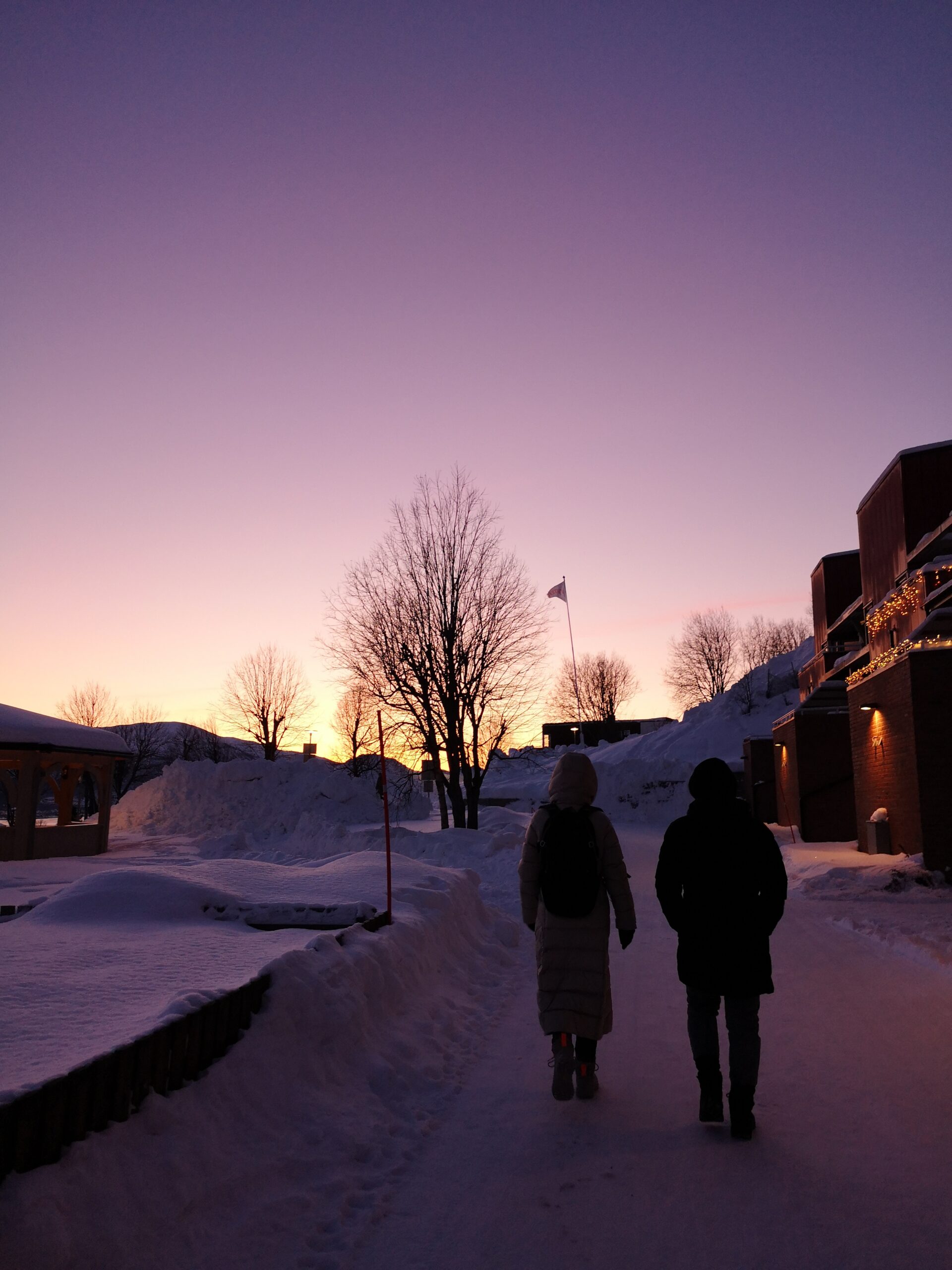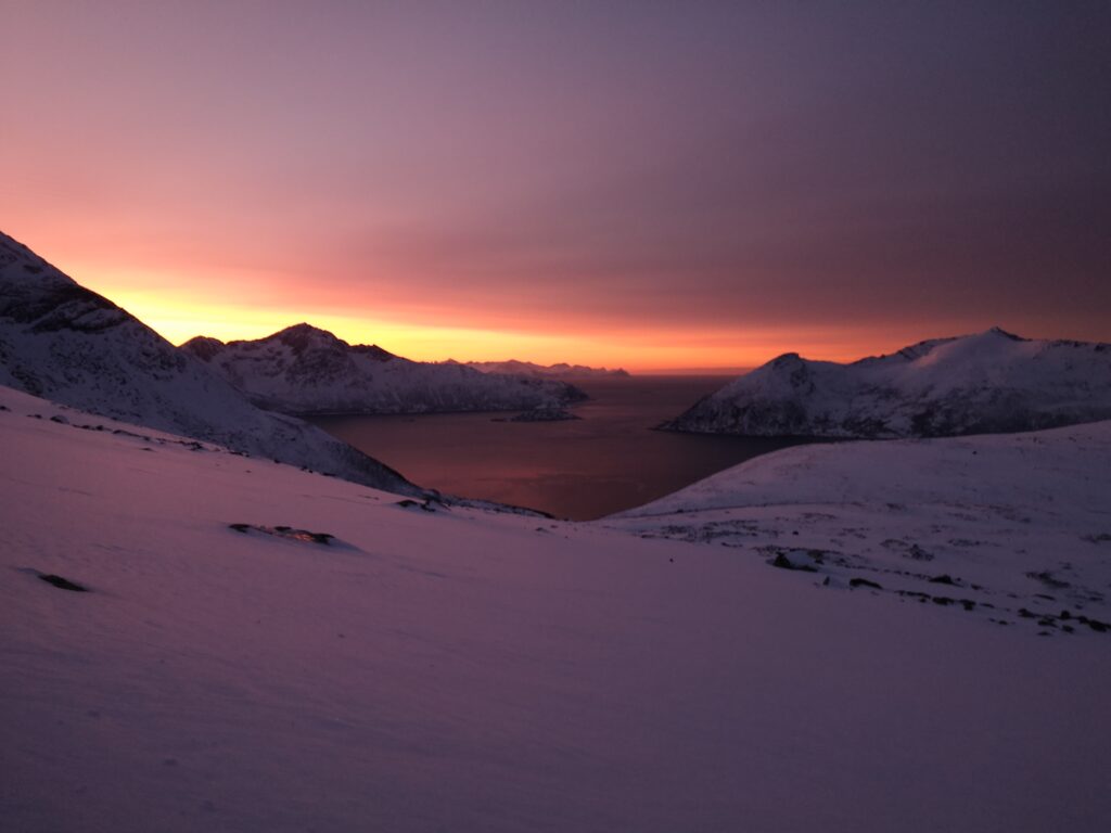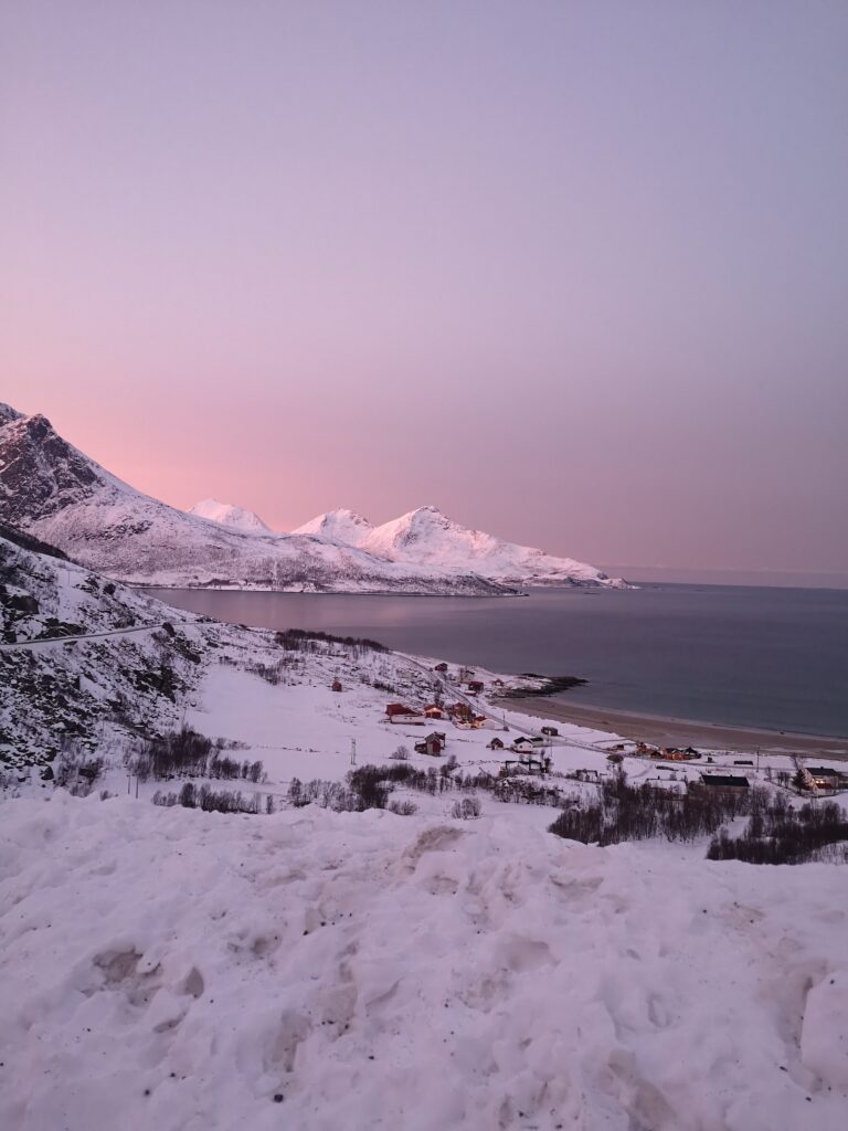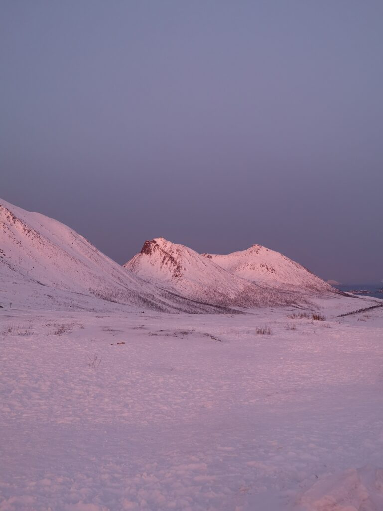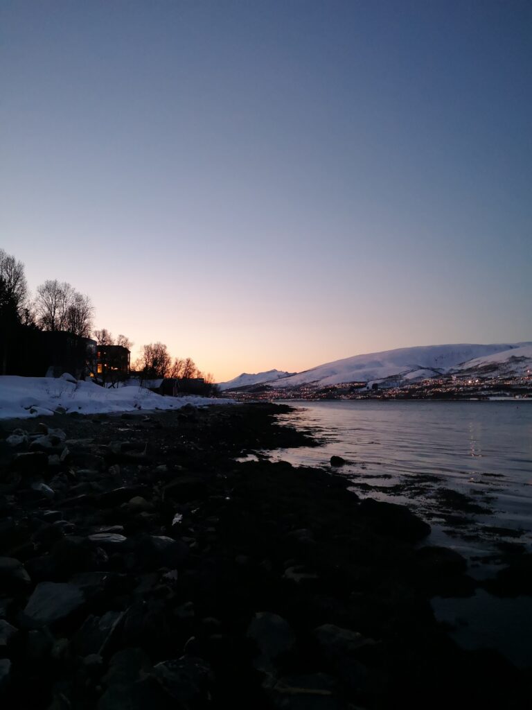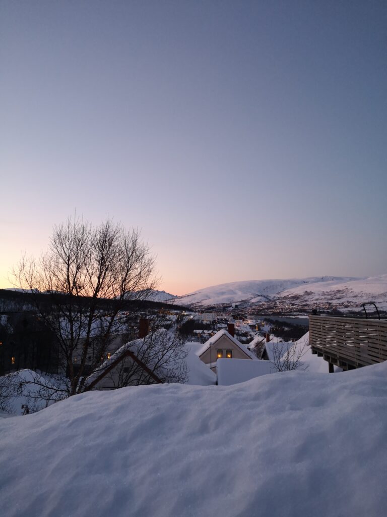 In der Winterzeit sind die Lichtstunden in Norwegen sehr begrenzt. Der Tag beginnt etwa um 9:30 Uhr und endet schon gegen 14:30 Uhr. Die Sonne geht zwar nie wirklich auf, aber die Dämmerung taucht den Himmel in wunderschöne und beeindruckende Farben. Diese besondere Lichtstimmung macht jeden Spaziergang durch die verschneiten Straßen von Tromsø zu einem unvergesslichen Erlebnis.